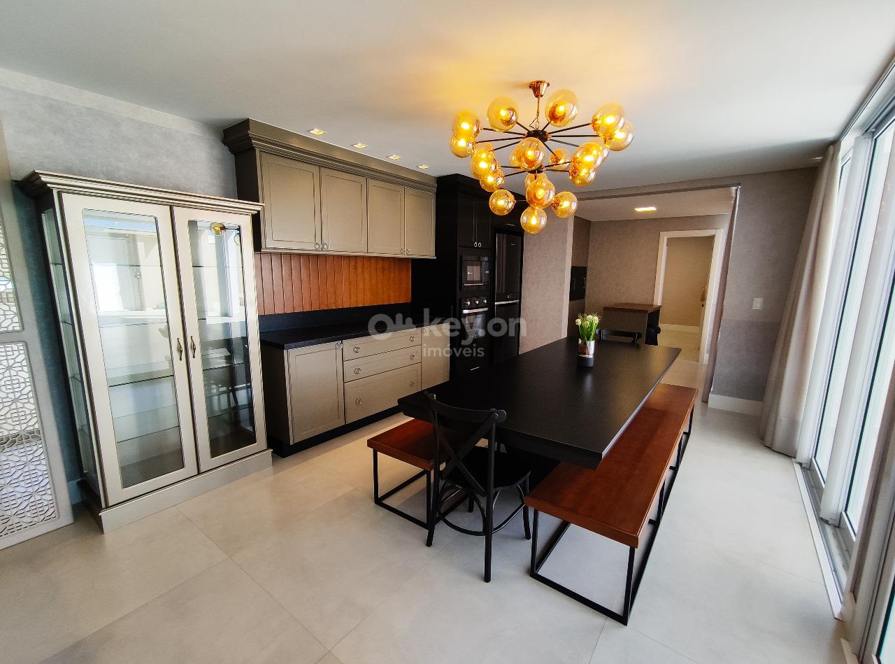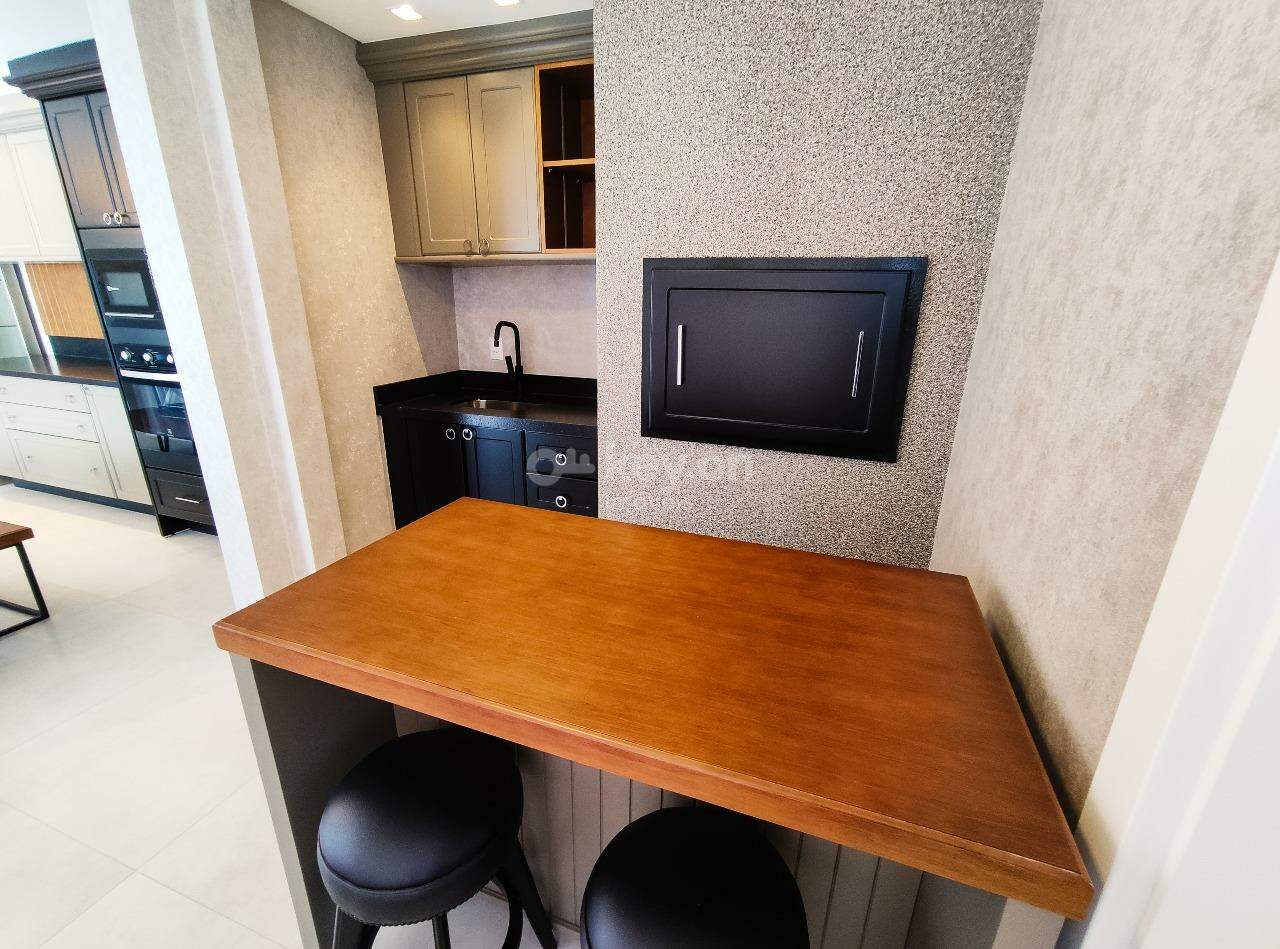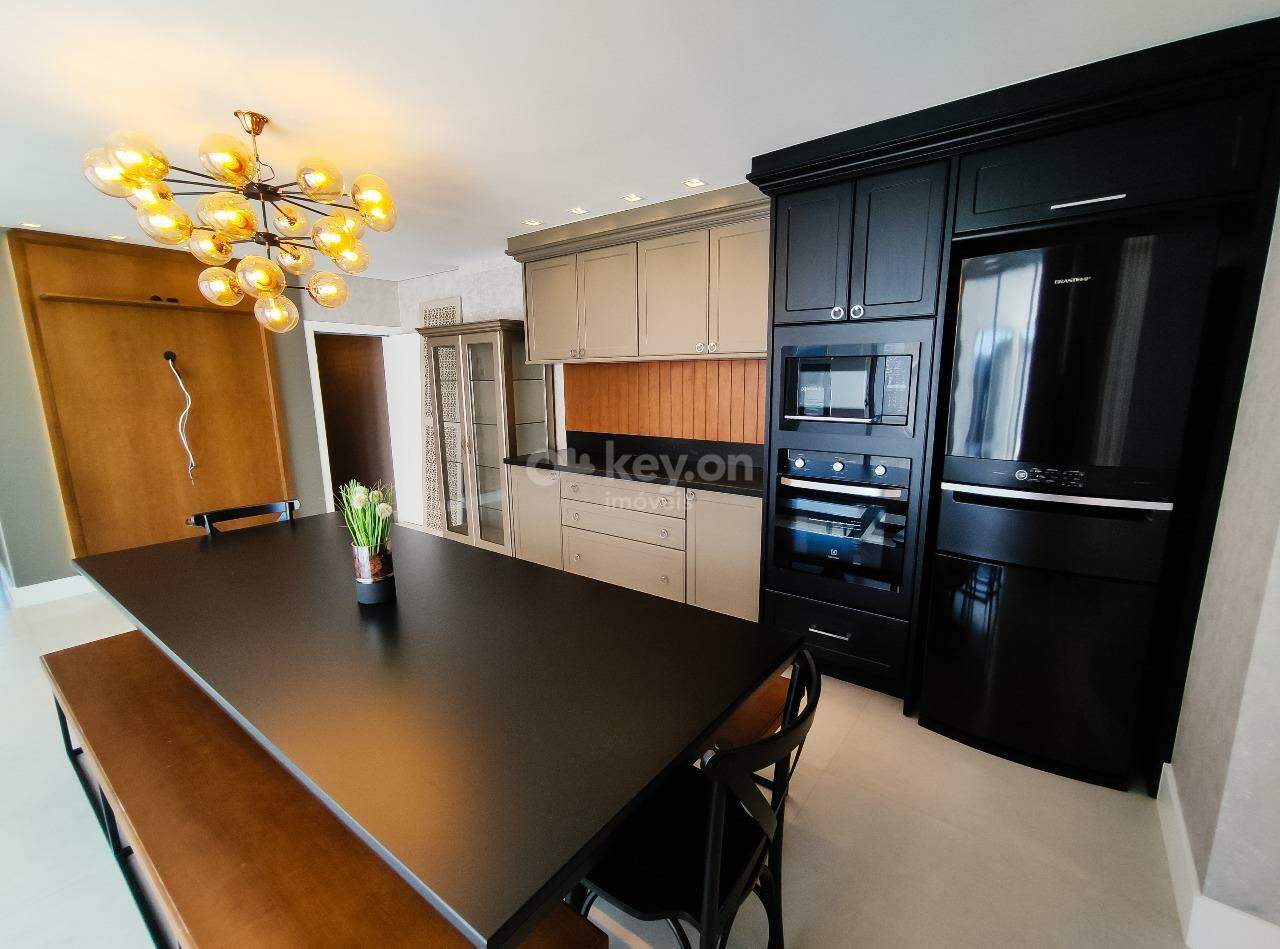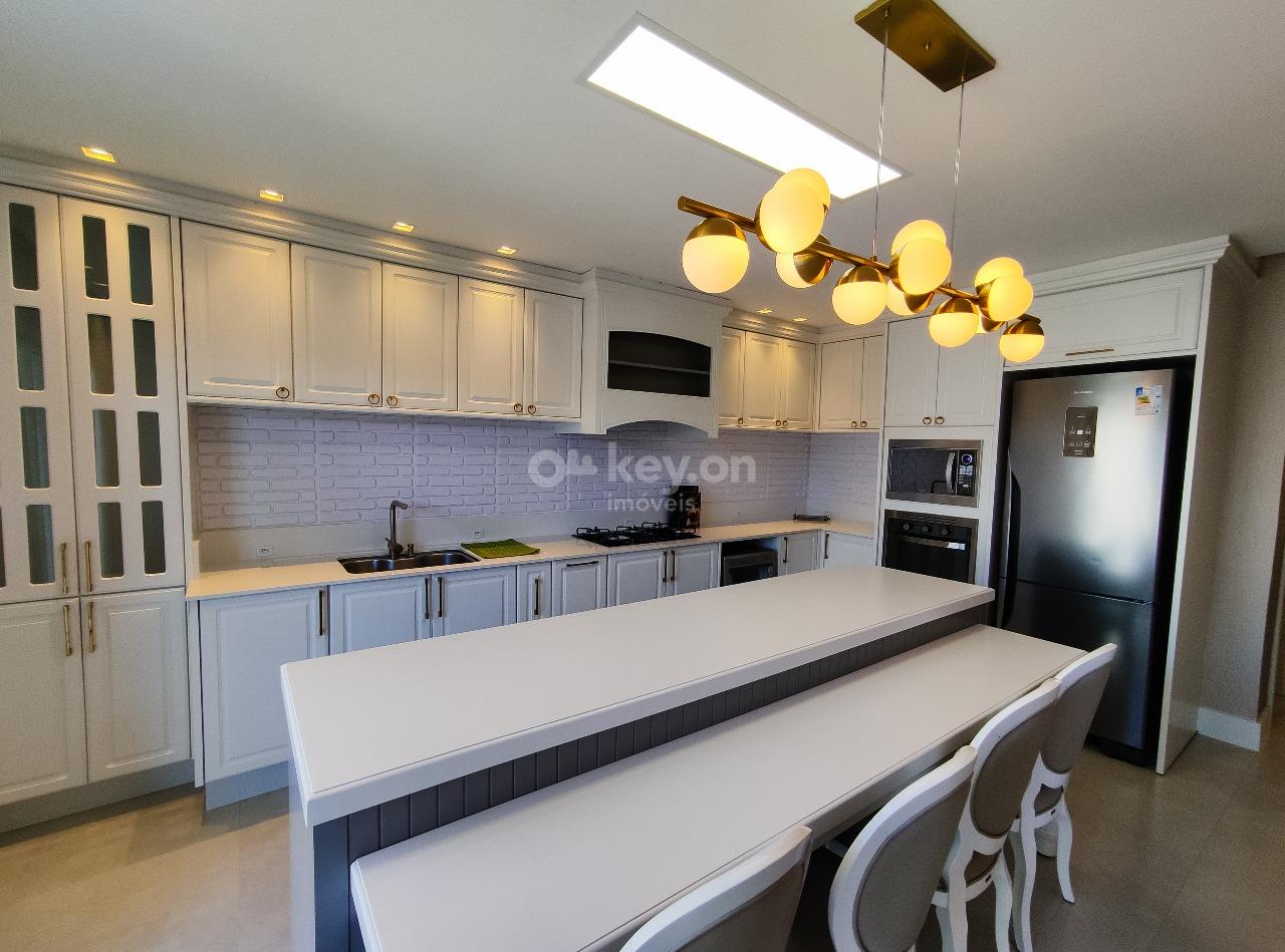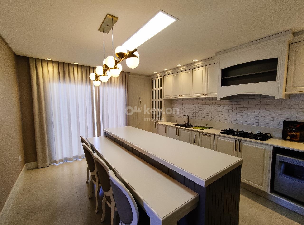 A cozinha é super completa, com uma bancada em ilha e uma visão ampla da sala.