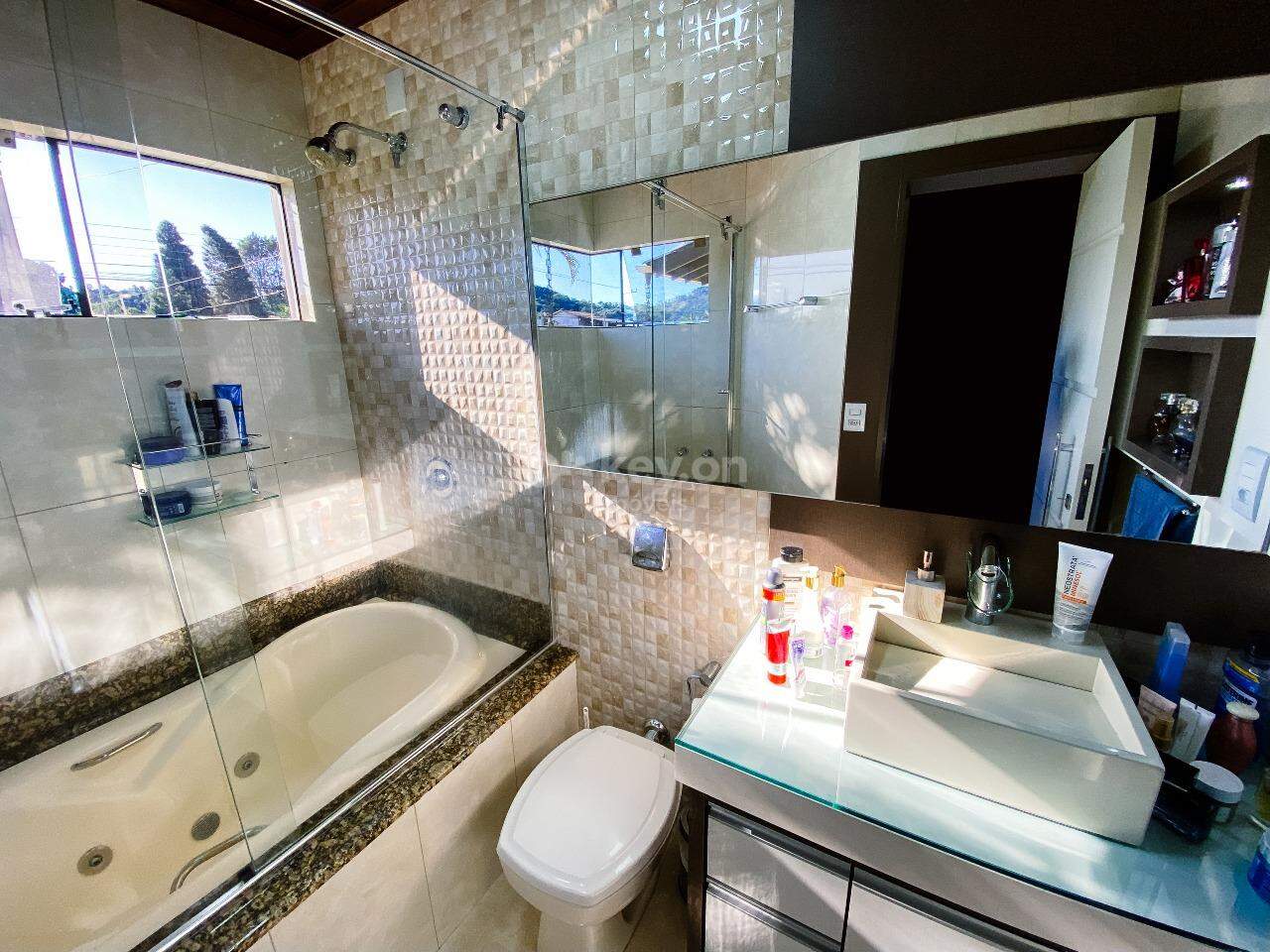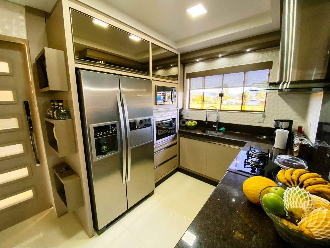Na parte térrea, uma piscina e uma área gourmet, para receber convidados. A garagem acomoda 6 carros.