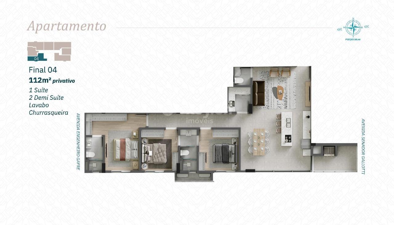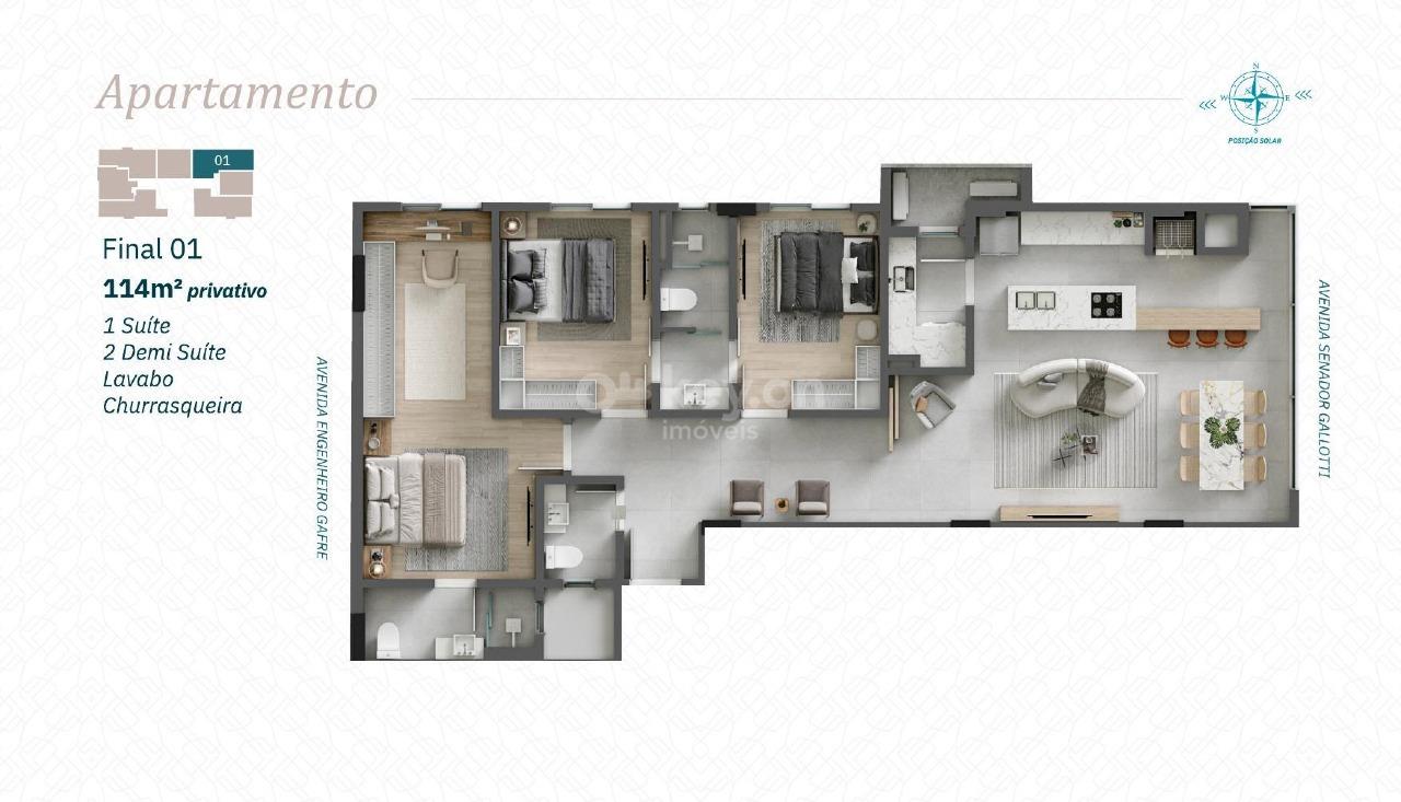 Apartamentos amplos, com áreas de 81 m² a 114 m², opções de 2 ou 3 dormitórios com suíte.