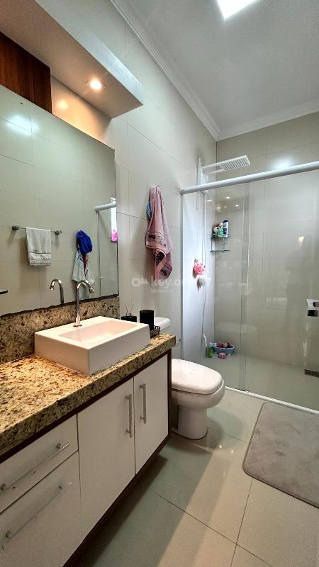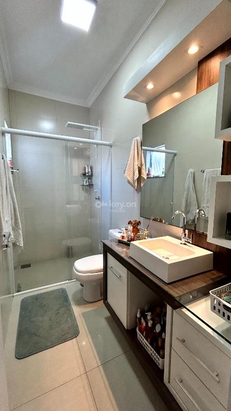 O banheiro social conta com móveis sob medida, box de vidro e chuveiro.