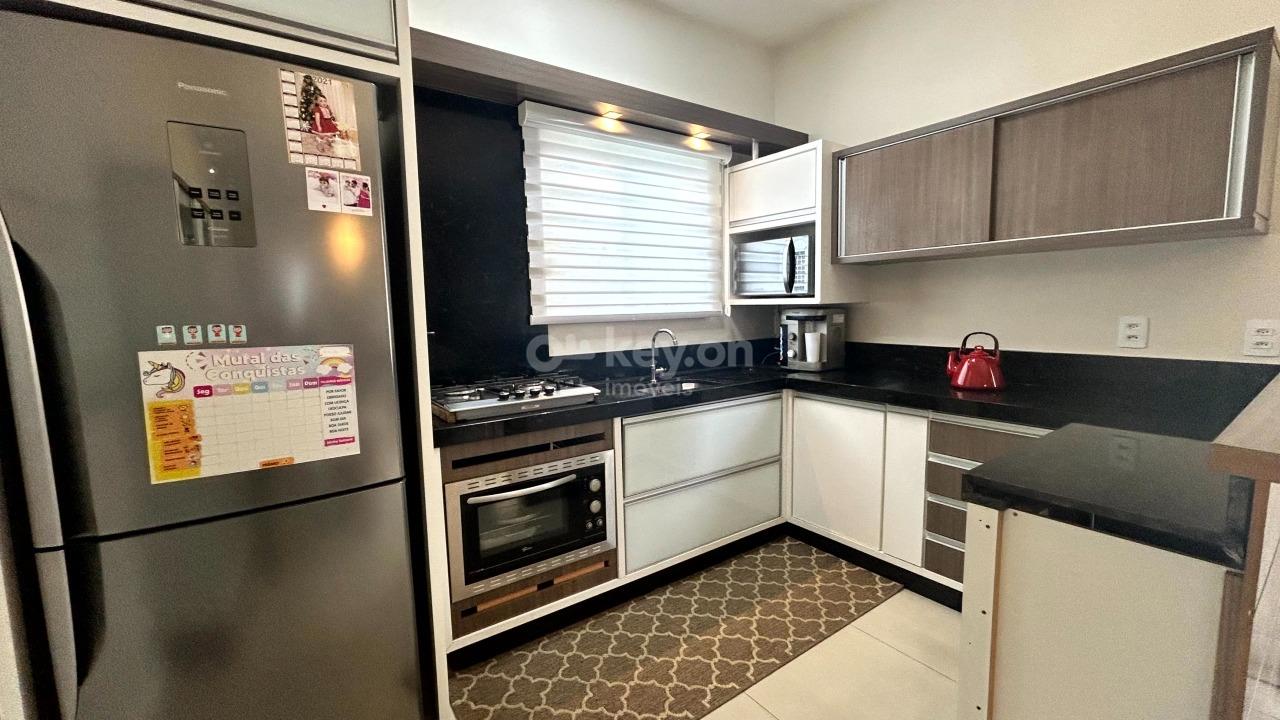 Na área de sala e cozinha, permanecem rack, cortina, mesa com cadeiras, cristaleira, móveis sob medida na cozinha, fogão, forno, filtro de água, persiana, lustre e interfone, compondo um ambiente funcional e pronto para o dia a dia.